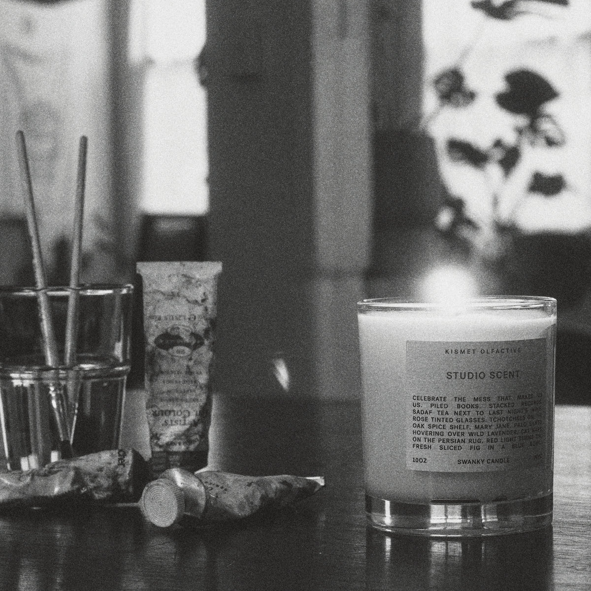 Studio Scent celebrates the mess that makes us us: used books and vintage records piled up around the room; a cup of steeped black tea next to last night’s glass of wine; dusty tchotchkes on the oaken spice shelf; mary jane; palo santo smoke hovering over a vase of wilting lavender; allure coming from the bedroom; two soft figs in a bowl of oranges.